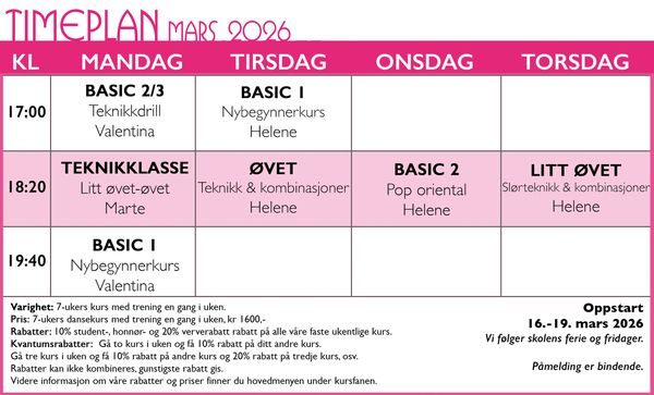 Kursstart på Studio Orient 16.-19. mars 2026. Nybegynnerkurs i magedans starter mandag 16. mars og tirsdag 17. mars.